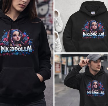 T-shirts and hoodies featuring Inkeddollai illustrations.